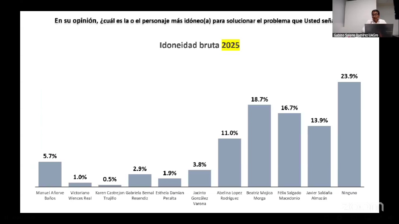 El "Estudio de perfil o imagen de actores políticos de Guerrero, 2025", presentado por el académico Gabino Solano Ramírez y los estudiantes del posgrado, revela que ante la pregunta de cuál personaje sería el más idóneo para solucionar los problemas del estado, un 18.7% de los encuestados se inclinó por Mojica Morga. En segundo lugar se ubicó Salgado Macedonio con un 16.7%, seguido por el rector de la UAGro, Javier Saldaña Almazán, con un 13.9%, y la alcaldesa de Acapulco, Abelina López Rodríguez, con un 11%.