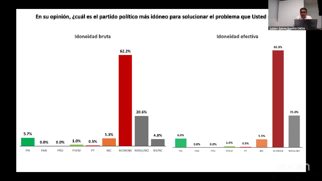 Más allá de los perfiles individuales, el análisis confirma la sólida posición de Morena como fuerza política dominante. Un 62% de los entrevistados considera que Morena es el partido más idóneo para resolver los problemas de Guerrero, una cifra que asciende al 65% al calcular la "idoneidad efectiva" (eliminando la no respuesta). El PRI y Movimiento Ciudadano aparecen muy por detrás, con 5.7% y 5.3% respectivamente.