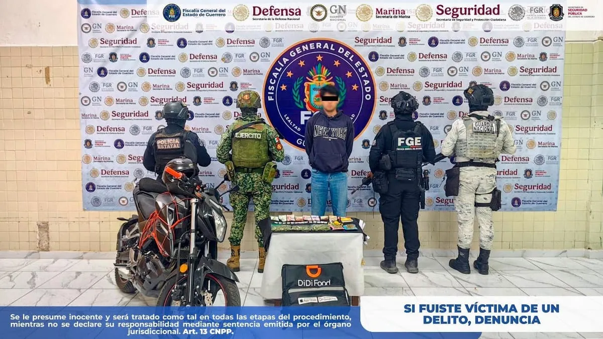 Chilpancingo, Guerrero.- Un hombre identificado como Óscar “N” fue detenido en Chilpancingo de los Bravo con una mochila de reparto en la que se localizaron distintas bolsas con presunta droga, dinero en efectivo y una motocicleta. El hecho ocurrió durante recorridos de vigilancia realizados por autoridades estatales y federales, informó la Fiscalía General del Estado de Guerrero.
