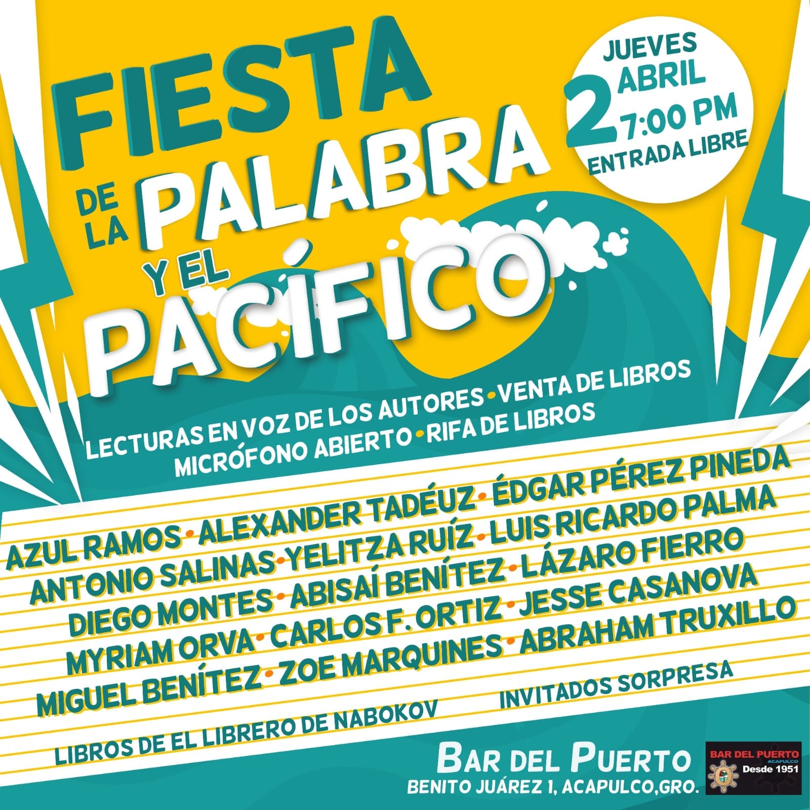 Acapulco, Guerrero.- Con la participación de autoras y autores con experiencia y noveles escritores y escritoras, la comunidad literaria de Acapulco y de Guerrero, realizaron la segunda “Fiesta de la Palabra y el Pacífico” en el Bar del Puerto en el marco de sus 75 aniversario.