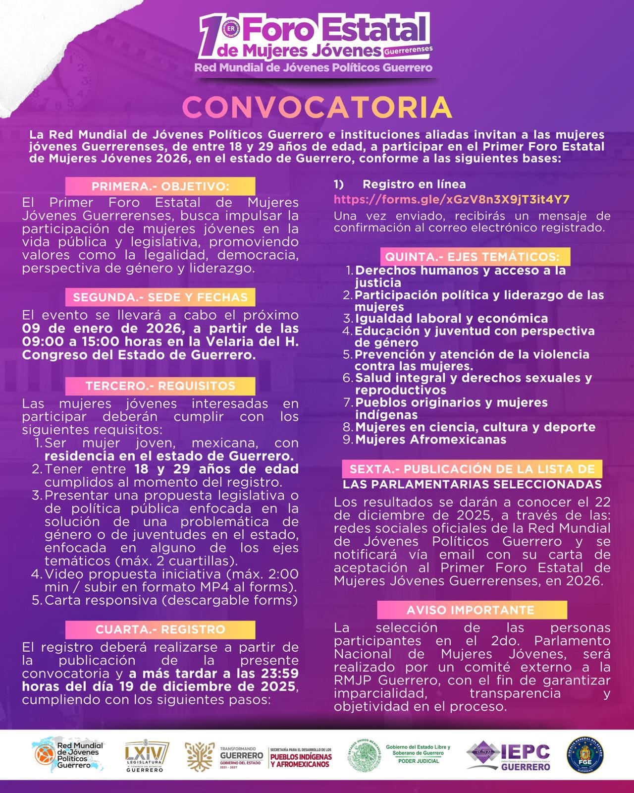 Las participantes informaron que la convocatoria estará abierta hasta el 19 de diciembre, y que el foro se llevará a cabo el 9 de enero de 2026, en un horario de 09:00 a 15:00 horas, en la explanada del Congreso del Estado de Guerrero.