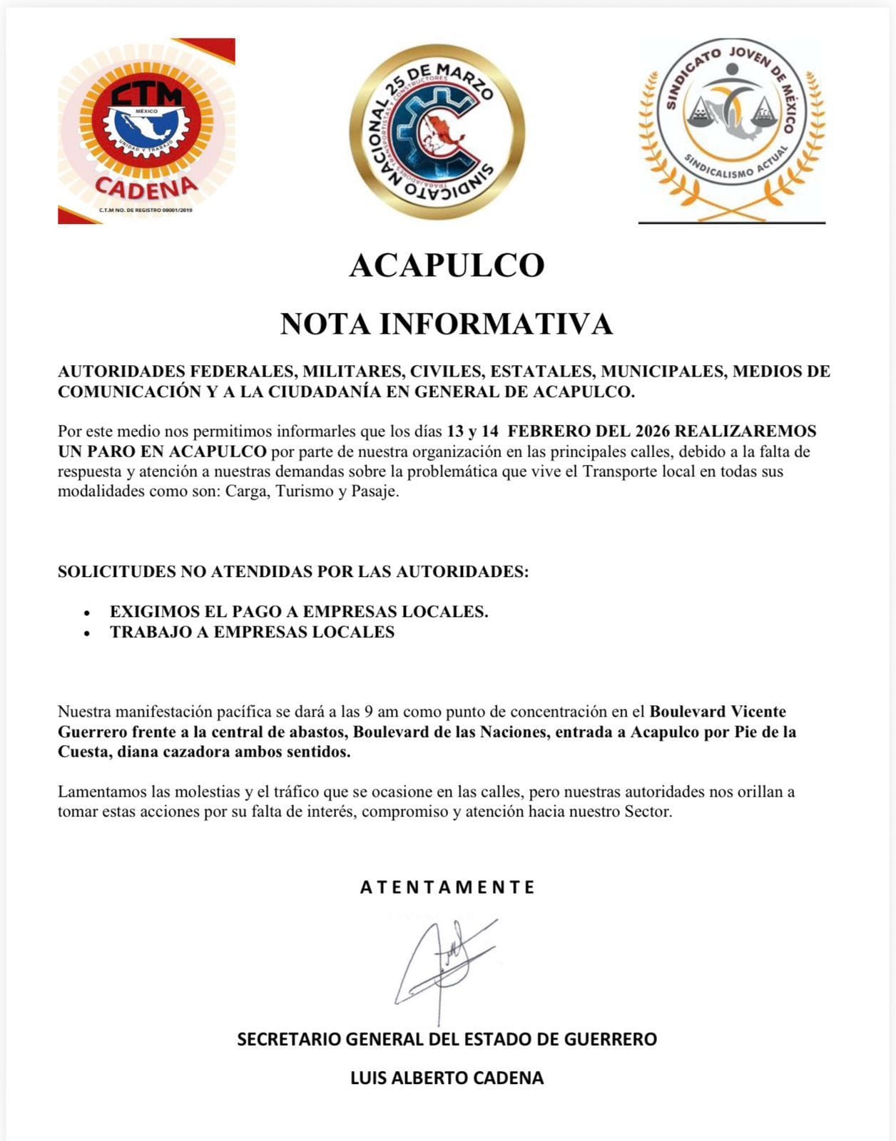 Acapulco, Guerrero. — La Confederación de Trabajadores de México (CTM) en Guerrero anunció la realización de un paro los días 13 y 14 de febrero en diversas vialidades principales de Acapulco, en protesta por la falta de respuesta de las autoridades a sus demandas relacionadas con el sector transporte.