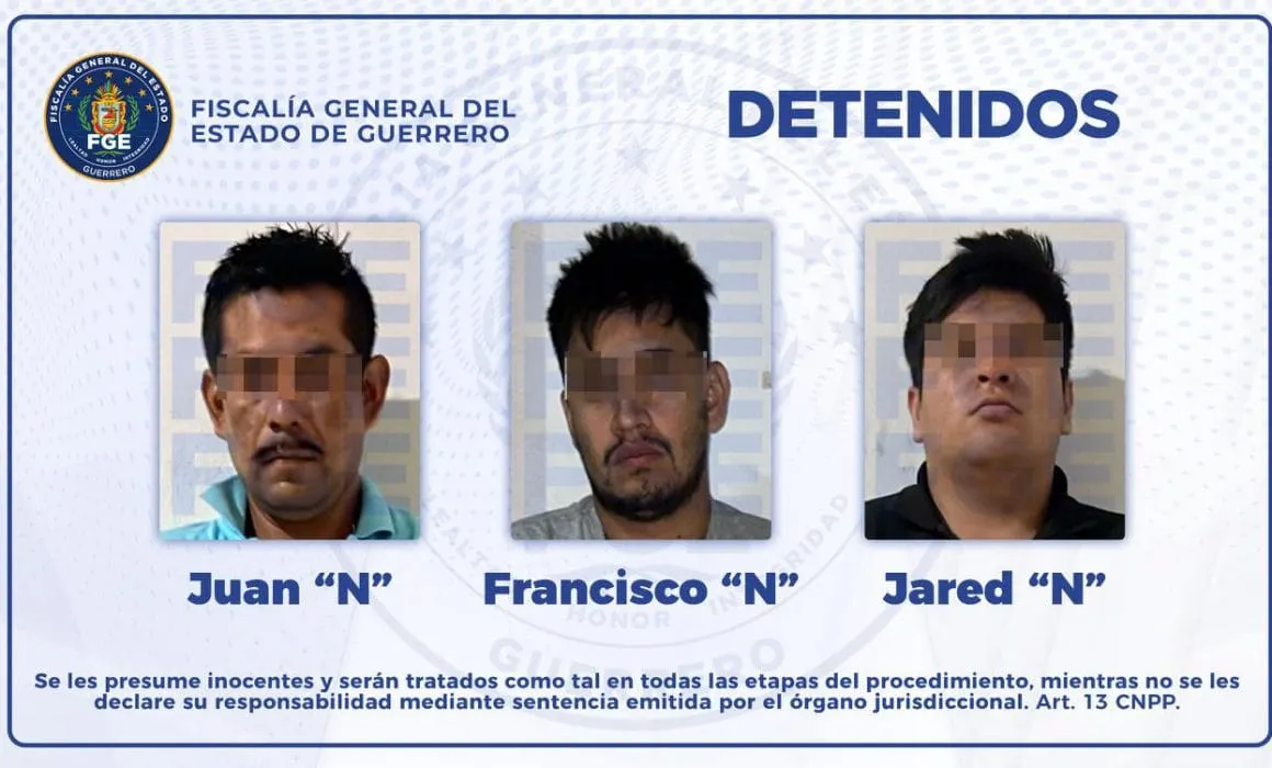 En un comunicado, la Fiscalía General del Estado (FGE) informó que cumplió una orden de aprehensión en contra de Juan N, Francisco N y Jared N detenidos en calles del de Chilpancingo, donde se les notificó del mandamiento judicial en su contra.