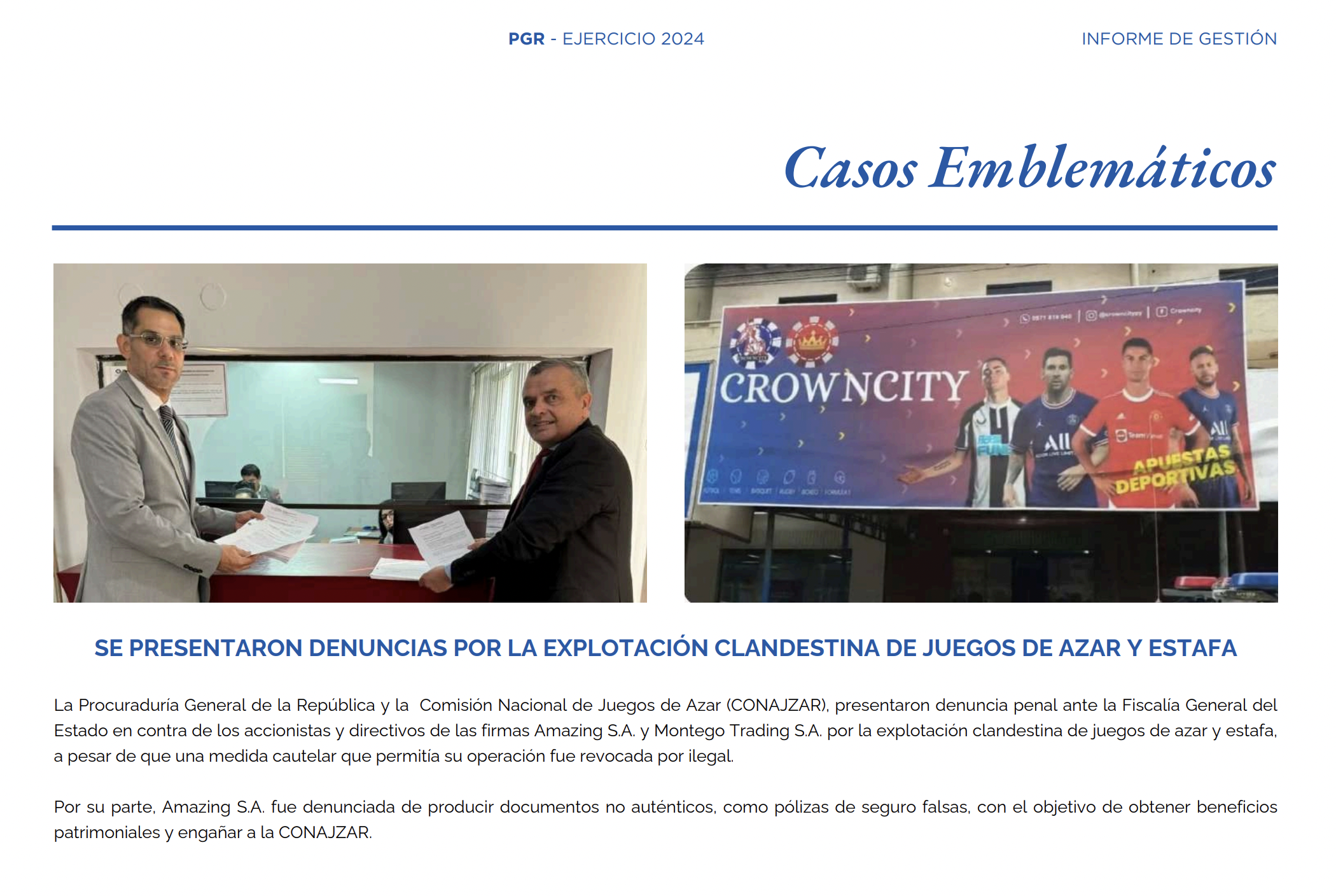 A través de diversos medios de comunicación, la Comisión Nacional de Juegos de Azar se enteró de que Montego Trading explotaba de forma ilegal y clandestina apuestas deportivas por medio de la página web “ crowncityplay.com.py ”.