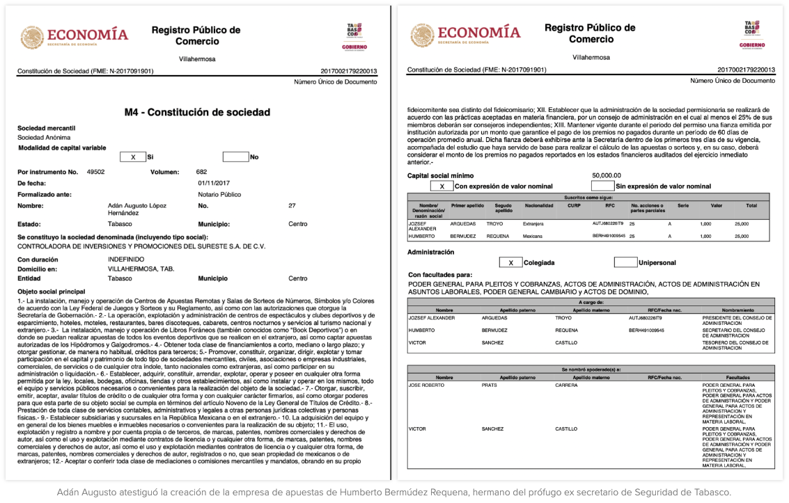 Controladora de Inversiones y Promociones del Sureste, empresa dedicada a la “instalación, manejo y operación de centros de apuestas remotas y salas de sorteos”, fue creada el 1 de noviembre de 2017, ante el notario número 27 de Tabasco, Adán Augusto López Hernández, según consta en el acta mercantil inscrita en el Registro Público de Villahermosa.