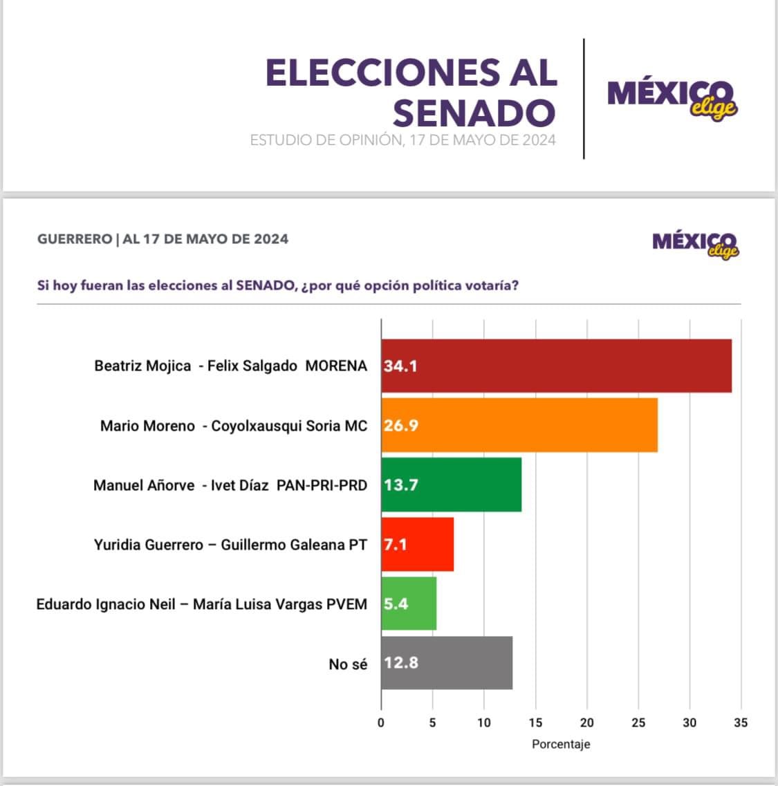 De acuerdo con la encuestadora México Elige, Moreno Arcos alcanzó 26.9 puntos de preferencia, por abajo de Félix Salgado, quien obtuvo el primer lugar con 34.1 por ciento de la intención del voto.