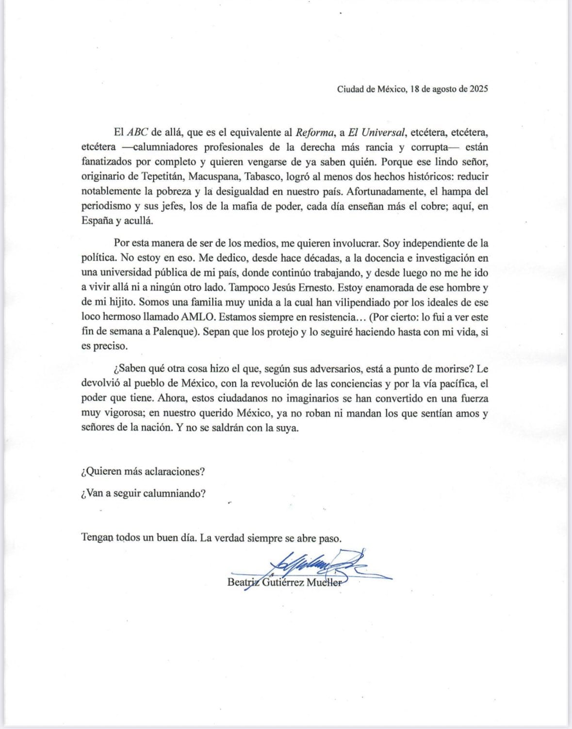 Beatriz Gutiérrez Müller, esposa del expresidente Andrés Manuel López Obrador negó las versiones sobre su presunta residencia en un barrio exclusivo de Madrid, España, y calificó al periódico ABC como “calumniadores profesionales de la derecha más rancia y corrupta” y acusó al medio de estar fanatizado y de buscar vengarse “de ya saben quién”.