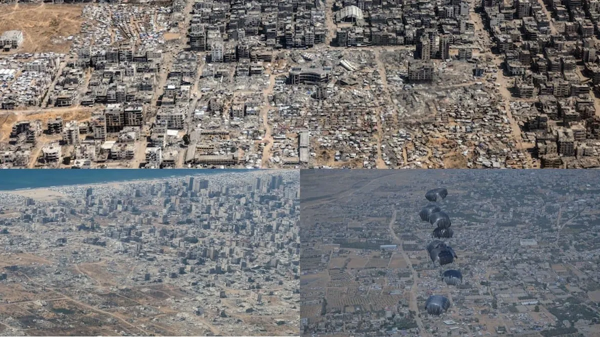 Desde el aire, los daños son evidentes. En el norte de Gaza y en Ciudad de Gaza, los edificios se reducen a pilas de escombros, las avenidas están cubiertas de polvo y las zonas residenciales han desaparecido. Solo a través de una cámara de largo alcance se distingue a pequeños grupos de personas de pie entre las ruinas, únicas señales de vida en un paisaje que parece inhabitable.