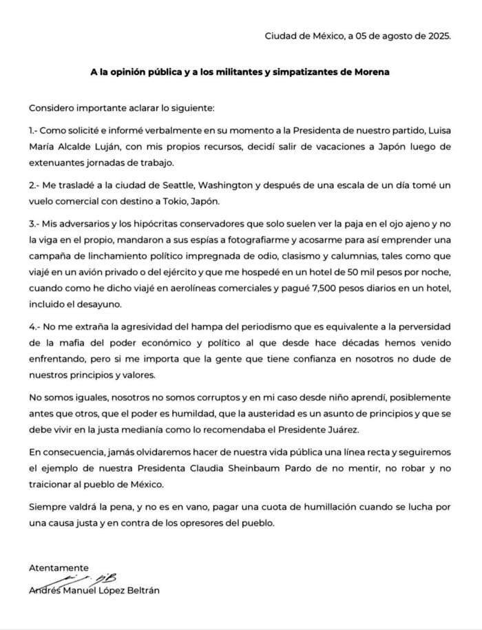 Andrés Manuel López Beltrán, hijo del expresidente López Obrador y actual secretario de Organización de Morena, publicó una ‘carta aclaratoria’ sobre sus vacaciones en Japón.