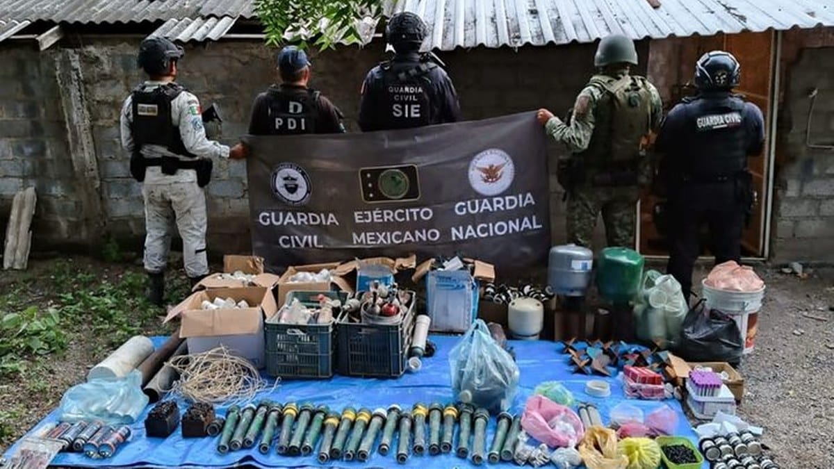 En el lugar, autoridades localizaron decenas de explosivos de fabricación casera, para ser activados a través de drones o mediante morteros elaborados de forma artesanal por los sicarios.