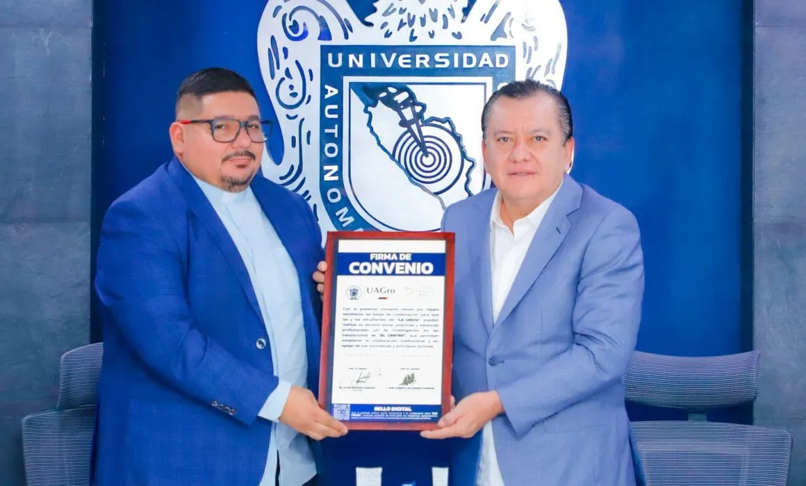 El rector de la Universidad Autónoma de Guerrero, Javier Saldaña Almazán firmó un convenio de colaboración con el defensor de los derechos humanos y sacerdote José Filiberto Velázquez Florencio, director del Centro Minerva Bello, una organización no gubernamental que se enfoca en la defensa y protección y acompañamiento de las familias víctimas de violencia.