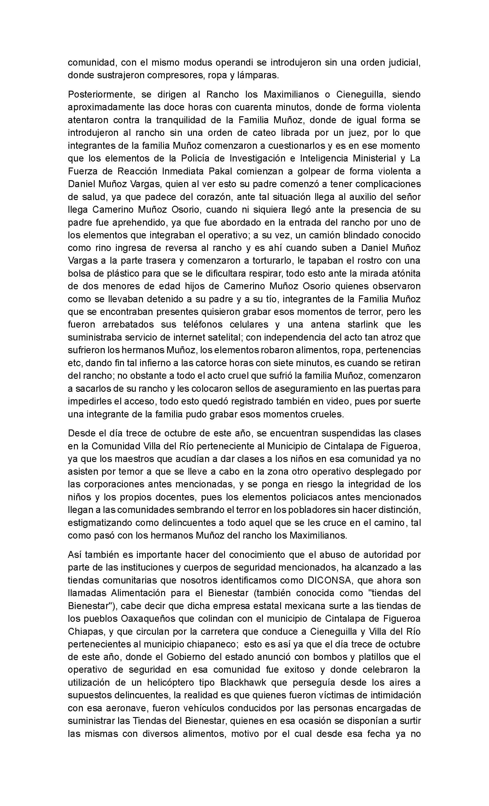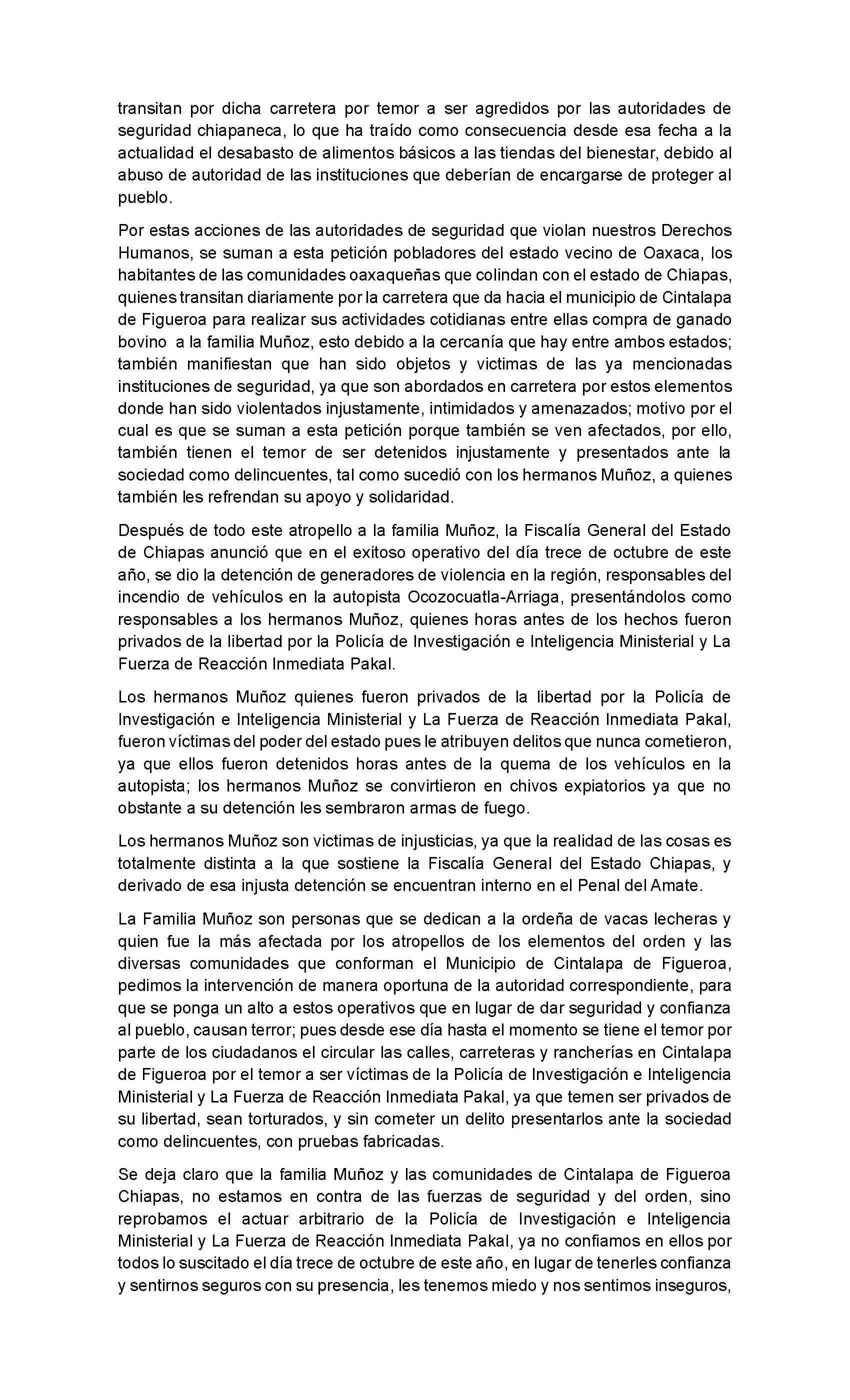 El caso de los hermanos Muñoz expone un patrón sistemático de abuso de poder. El 13 de octubre de 2025, elementos de la Fuerza de Reacción Inmediata Pakal, la Policía de Investigación e Inteligencia Ministerial, la Guardia Nacional y la Secretaría de la Defensa Nacional ejecutaron un operativo denunciado por detenciones arbitrarias, tortura, confiscación de teléfonos y destrucción de hogares. Los hermanos fueron acusados de la quema de vehículos en la autopista Ocozocuautla–Arriaga, a pesar de haber sido detenidos horas antes de los hechos.