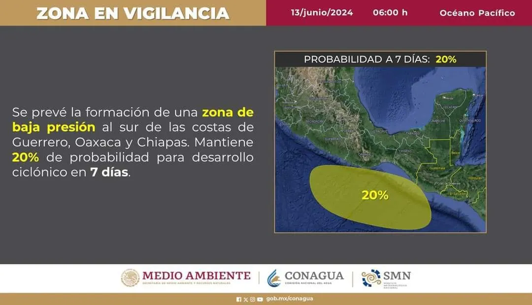 La gobernadora Evelyn Salgado Pineda informó que, de acuerdo con el pronóstico de la Comisión Nacional del Agua (Conagua) y el Servicio Meteorológico Nacional (SMN), se espera la formación de una zona de baja presión frente a las costas de Guerrero con un 20% de probabilidad de desarrollo ciclónico en los próximos días.