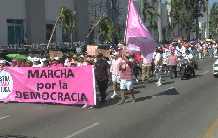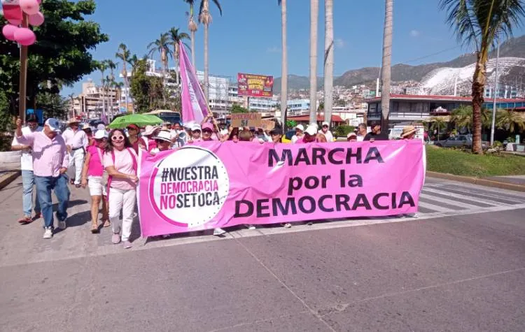 Acapulco, 18 de febrero de 2024.- Vestidos de rosa y blanco cientos de personas marcharon por la avenida Costera Miguel Alemán como parte de la movilización nacional en defensa de la democracia.