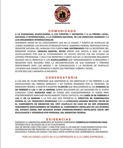 Los manifestantes, en su comunicado, no solo exigen la liberación inmediata de Rodríguez Nava sino también una solución integral a las incidencias del pre-registro telefónico y a aquellos ciudadanos que quedaron fuera del censo oficial.