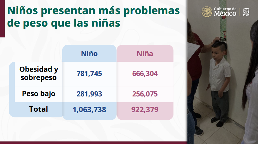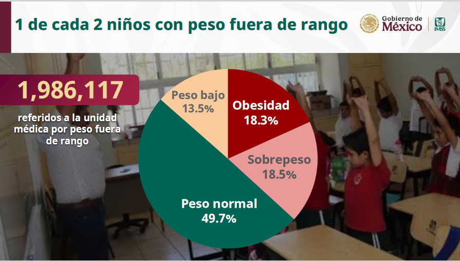 De acuerdo con los resultados de la Estrategia Nacional Vive Saludable, Vive Feliz, dados a conocer en la conferencia mañanera de este 04 de agosto de 2025, por el Secretario de Educación Pública, Mario Delgado Carrillo, el 36% de niñas y niños mexicanos evaluados tienen problemas de sobrepeso y obesidad, además un 13 por ciento presenta peso bajo, lo que presentan problemas de desnutrición o crecimiento.