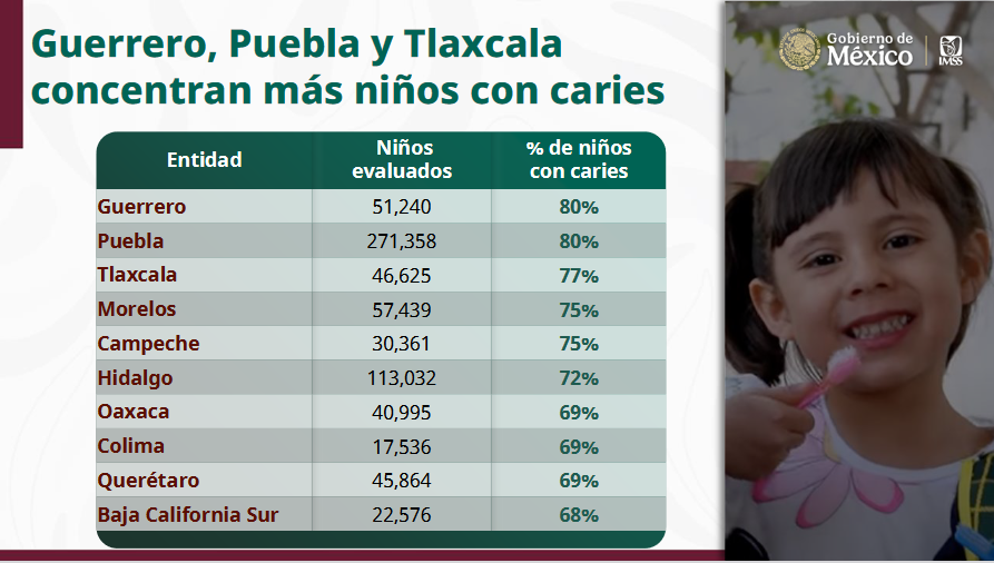 En el llamado el "primer ejercicio de macroprevención en salud de los adultos del futuro", en coordinación con el IMSS y la Secretaría de Salud que arrancó el 12 de marzo, el estado de Guerrero ocupa el primer lugar con niños y niñas con caries, el 80 por ciento de la población de educación primaria presentan esta enfermedad.