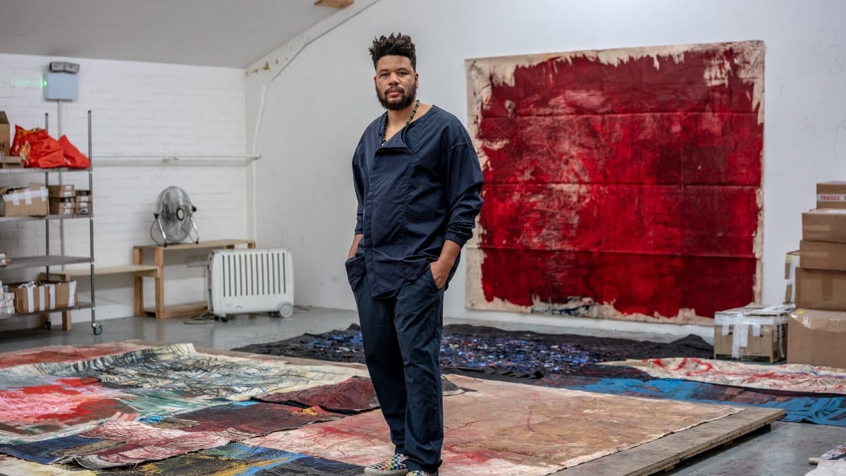 Oscar Murillo: Aunque es una estrella del mercado, su práctica mantiene una "suciedad" necesaria. Utiliza lienzos que se arrastran por el suelo, materiales industriales y una energía física que rompe con la estética digital y pulida de Instagram.