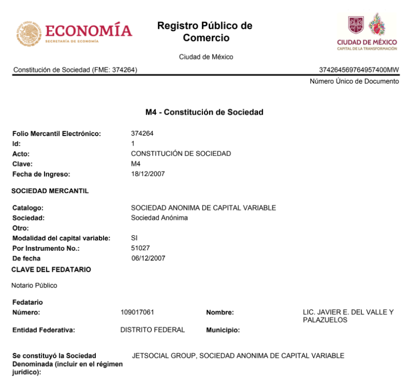 En actas inscritas en el Registro Público de Comercio, consultadas por MCCI, consta que Jetsocial Group es una empresa que fue constituida en diciembre de 2007 en la Ciudad de México por Jonathan Alexis Weinberg Pinto y Mauricio Samuel Weinberg López, ambos señalados por la UIF como prestanombres de García Luna.