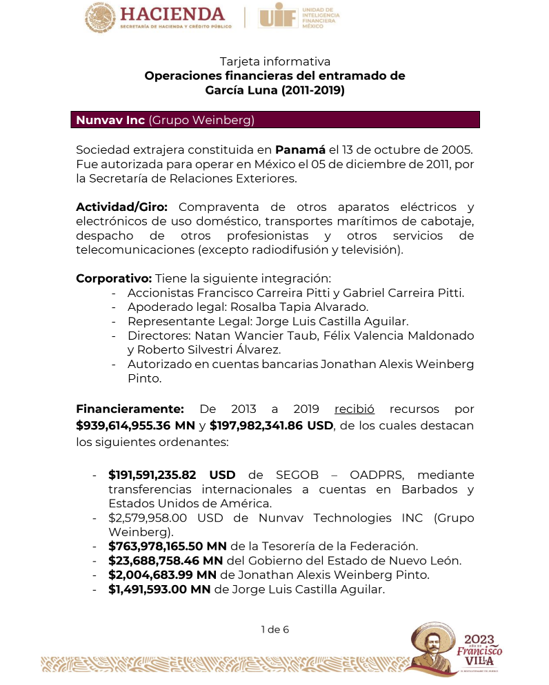 En un par de documentos de 2023 y 2024, la UIF refiere que Jetsocial Group envió recursos a Nunvav, Inc., empresa creada en Panamá y que ha sido señalada en investigaciones tanto en México como en Estados Unidos, de ser parte de la red de corrupción de García Luna y sus prestanombres.