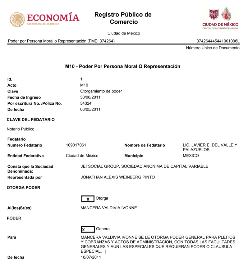 El 6 de mayo de 2011, Weinberg Pinto otorgó un poder legal a Ivonne Mancera Valdivia, que es quien firmó los contratos con el Gobierno de la Ciudad a nombre de Jetsocial Group.