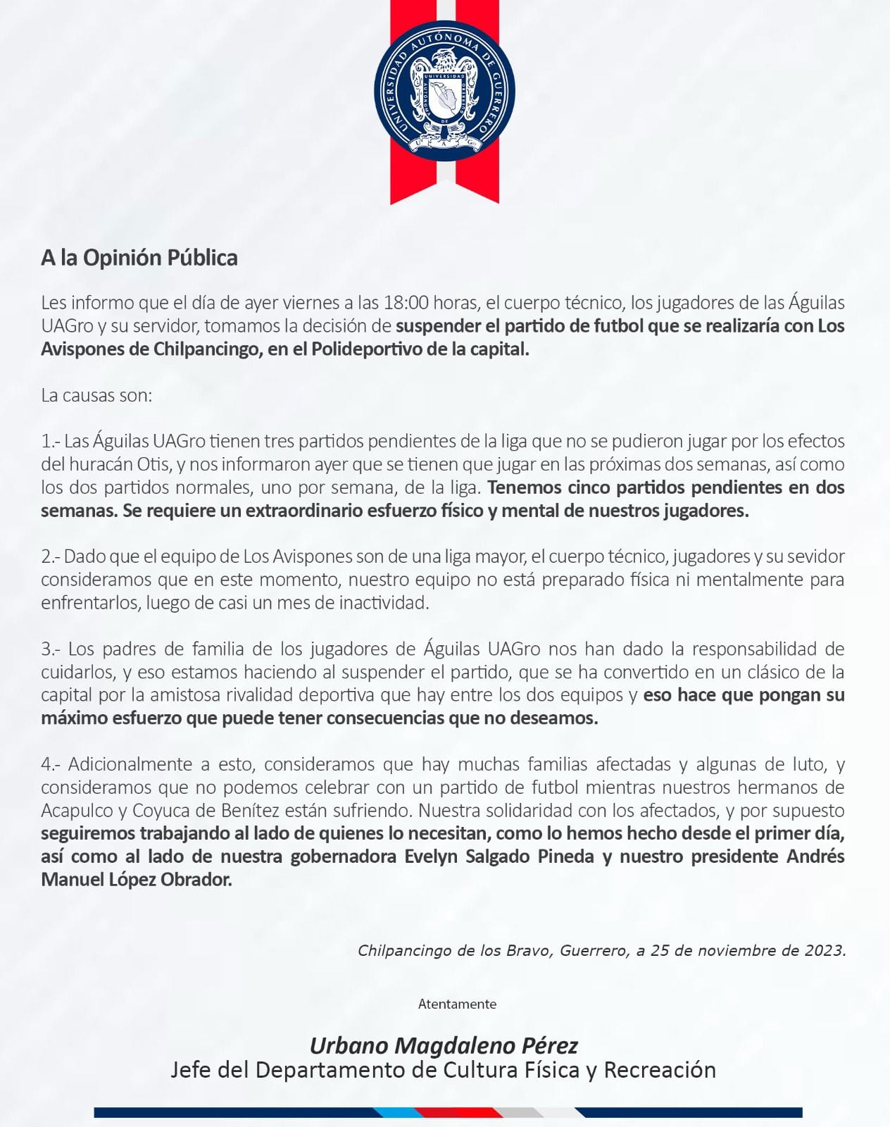 La decisión también se tomó considerando la responsabilidad hacia los jugadores, cuyos padres confían en el equipo para su cuidado. Además, se consideró inapropiado celebrar un partido mientras muchas familias están afectadas y de luto debido al huracán Otis en Acapulco y Coyuca de Benítez.