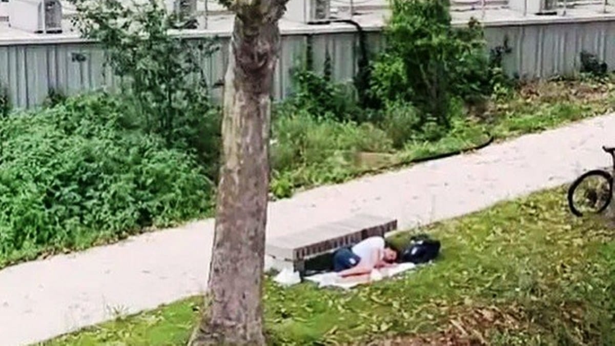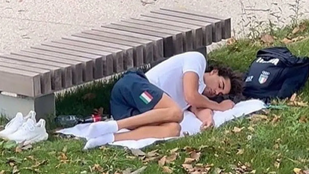 Thomas Ceccon, campeón olímpico en 100 metros espalda, aparece durmiendo a la sombra de un banco sobre una toalla, con la mochila y los zapatos al lado, en un parque de París.
