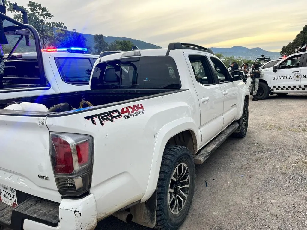 Los atacantes dejaron atrás una camioneta blanca Toyota con reporte de robo. En una revisión detallada del vehículo, se encontró: