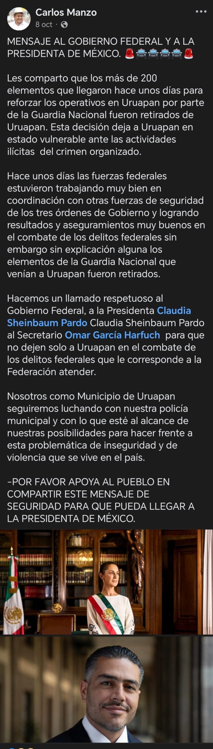 “Hacemos un llamado respetuoso al Gobierno Federal… para que no dejen solo a Uruapan en el combate de los delitos federales que le corresponde a la Federación atender”, escribió Manzo, y exhortó a la ciudadanía a difundir su mensaje para que llegara a Palacio Nacional.