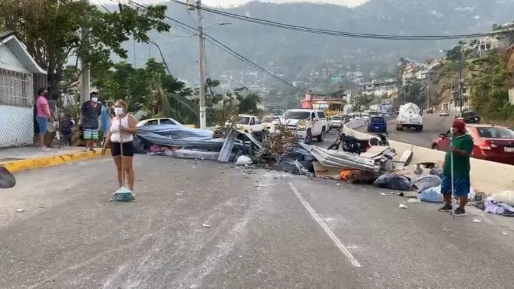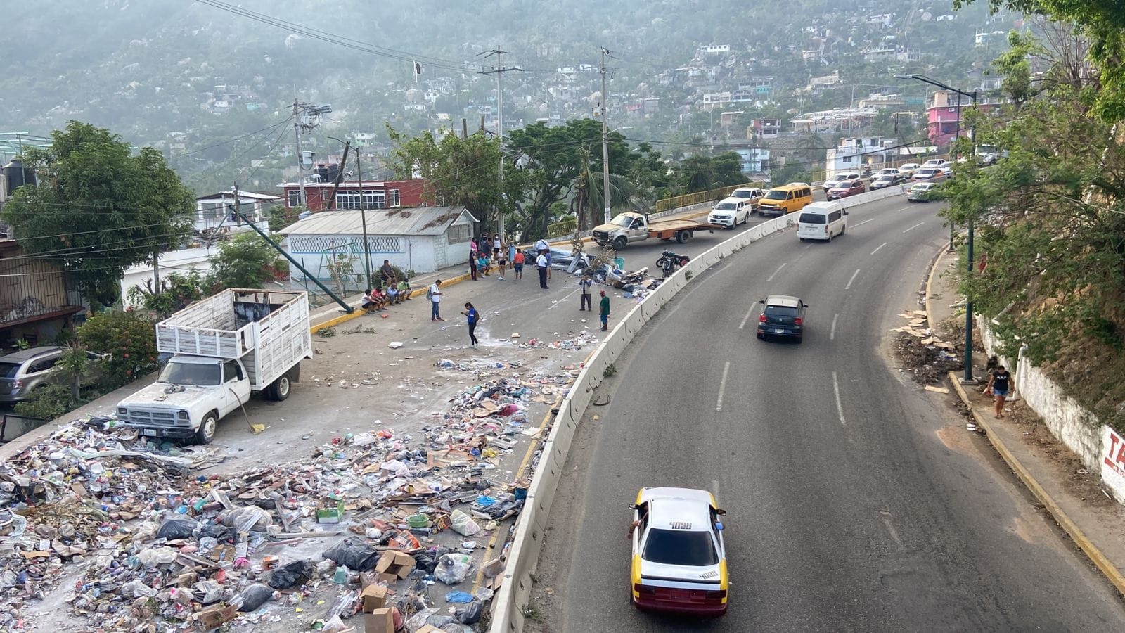Acapulco, 15 de diciembre de 2023.- Vecinos de la colonia Los Lirios bloquean la carretera México-Acapulco para exigir a las autoridades municipales y estatales la recolección de toda la basura acumulada desde el paso del huracán Otis.